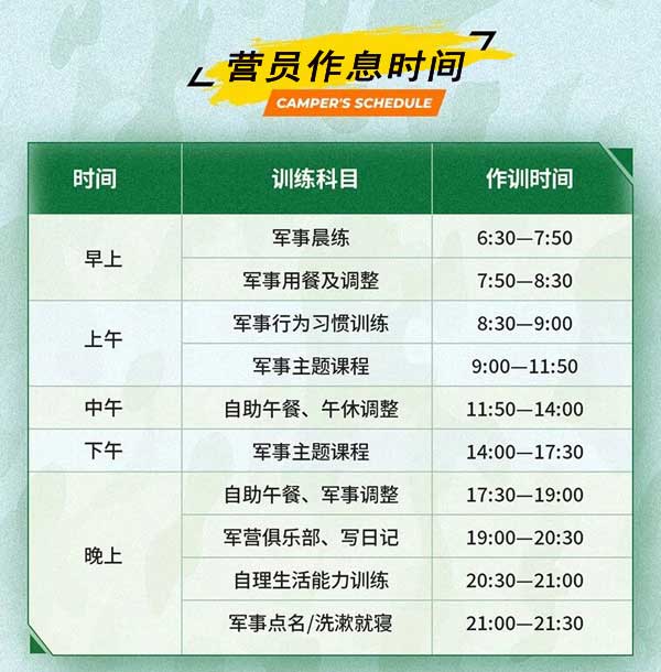 ◉ 费用包含:营地食宿、训管、服装、道具、资料、保险等;