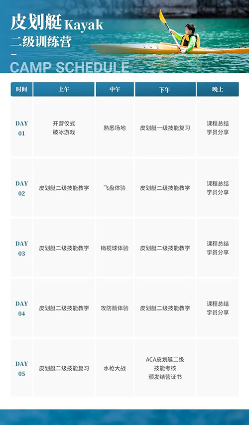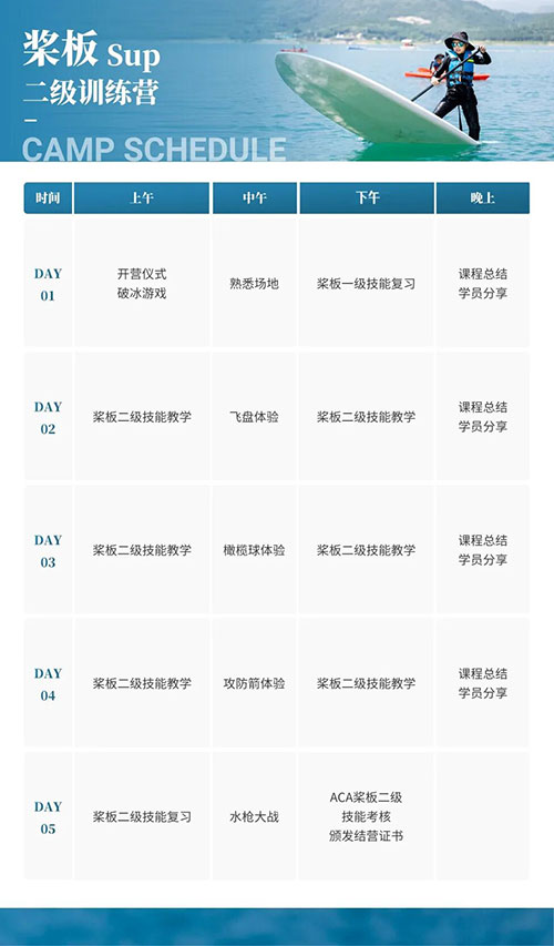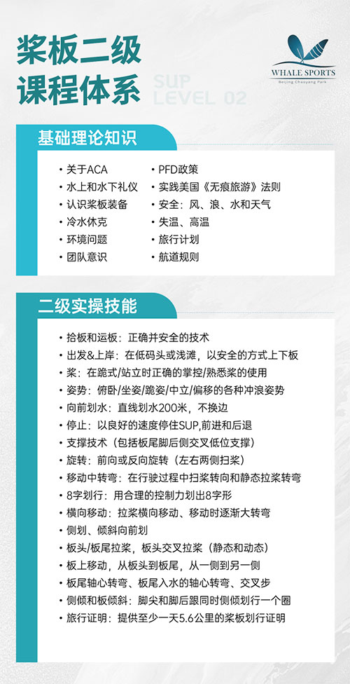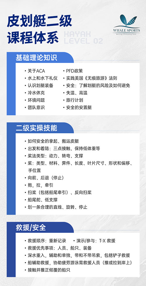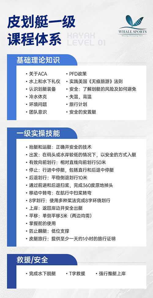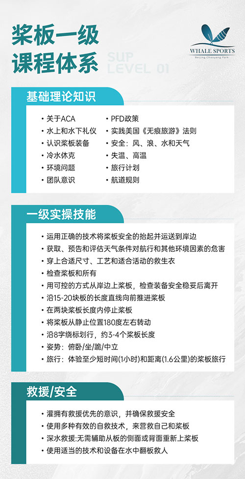 CURRICULUM SYSTEM课程体系课程中特别引入了美国ACA科普知识,培养他们对水上运动的热爱与敬畏;注重传授PFD原则,确保孩子们能够保障自身的安全;强调了水上和水下的适当礼仪,让孩子们在运动中展现优雅与尊重;引导孩子们尊重自然、保护环境,成为真正的环保小卫士。 通过这样的课程设计,我们旨在培养孩子们全面的水上运动素养,让他们在快乐学习的同时,也能够收获成长与智慧。 (点击放大查看) (点击放大查看)