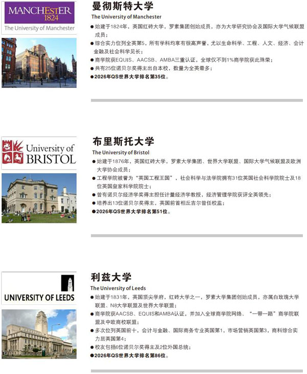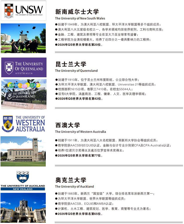 ➤ 可升海外大学名单(部分) 英 国: 曼彻斯特大学、布里斯托大学、利兹大学、格拉斯哥大学、南安普顿大学、诺丁汉大学、伯明翰大学、谢菲尔德大学、利物浦大学、巴斯大学、兰卡斯特大学等 澳大利亚: 悉尼大学、新南威尔士大学、蒙纳士大学、昆士兰大学、西澳大学、阿德莱德大学、悉尼科技大学、墨尔本皇家理工大学等 新 西 兰: 奥克兰大学、奥塔哥大学、坎特伯雷大学、惠灵顿维多利亚大学、梅西大学、奥克兰理工大学、林肯大学、怀卡托大学等
