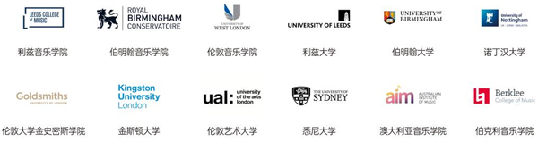 西澳大学、阿德莱德大学、麦考瑞大学、格里菲斯大学、迪肯大学、斯威本科技大学、西悉尼大学、塔斯马尼亚大学、伊迪斯科文大学、SAE创意传媒学院、昆士兰音乐学院、科廷大学等。