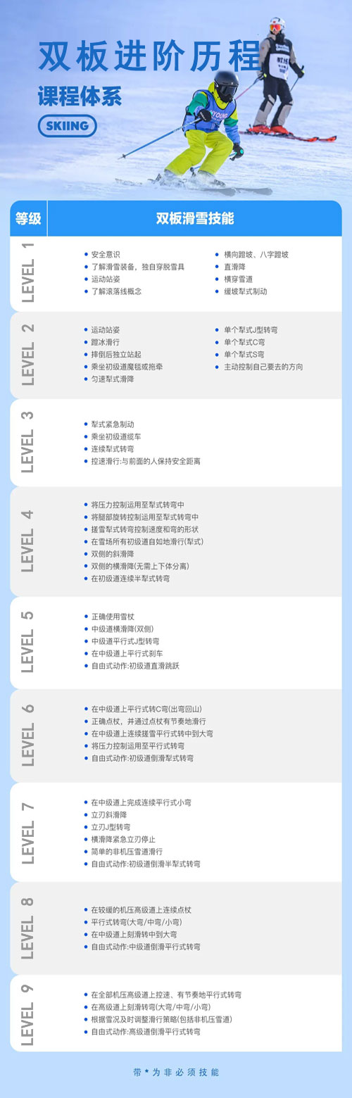 UYoung青少年滑雪学院,结合全球各大滑雪体系,以「北京大众滑雪锻炼等级标准」为总纲,打磨出了更适合中国青少年体制的1-9级进阶式教学体系,高效培养滑雪技能,专业学习考核。