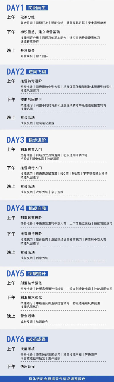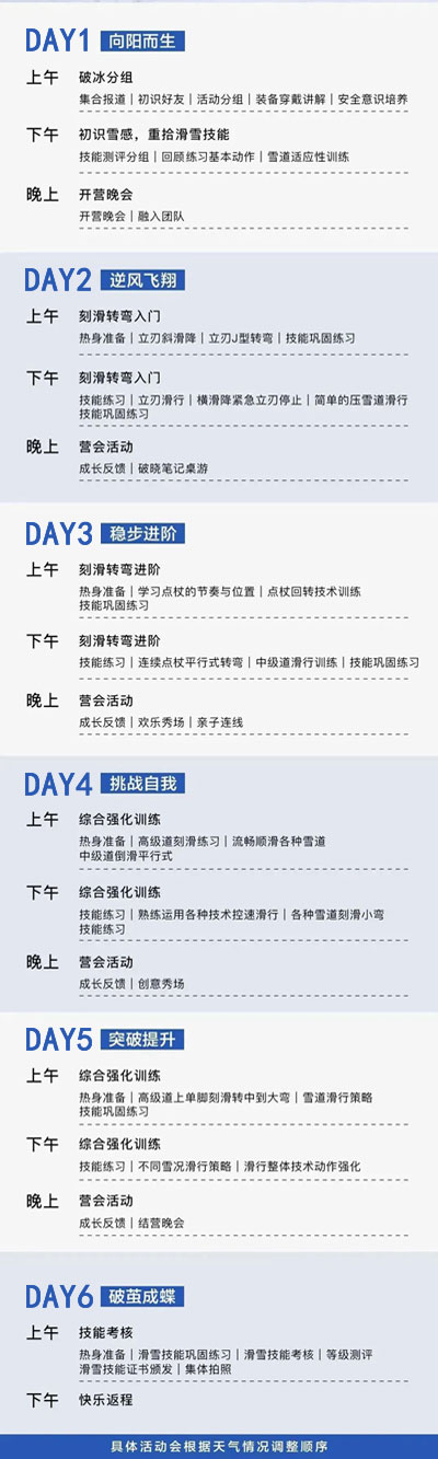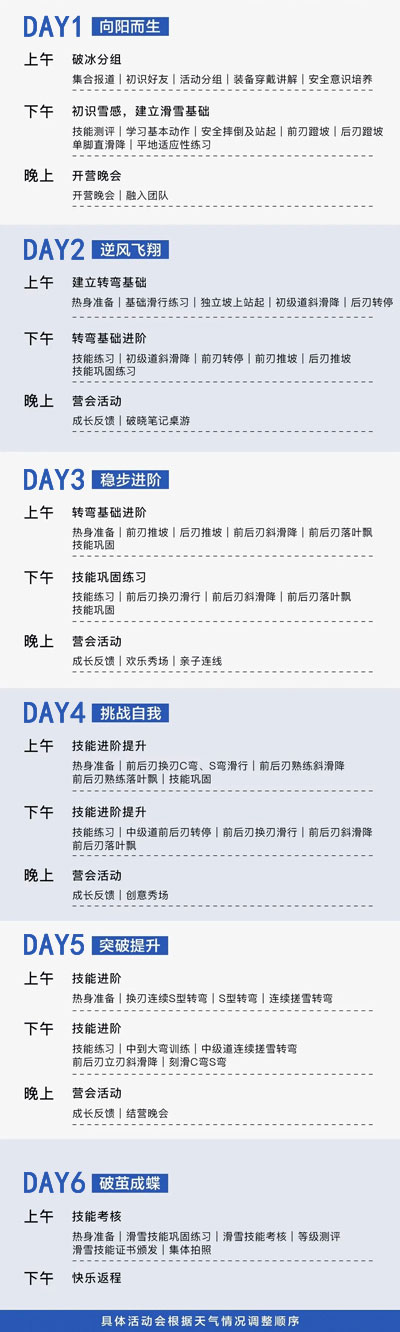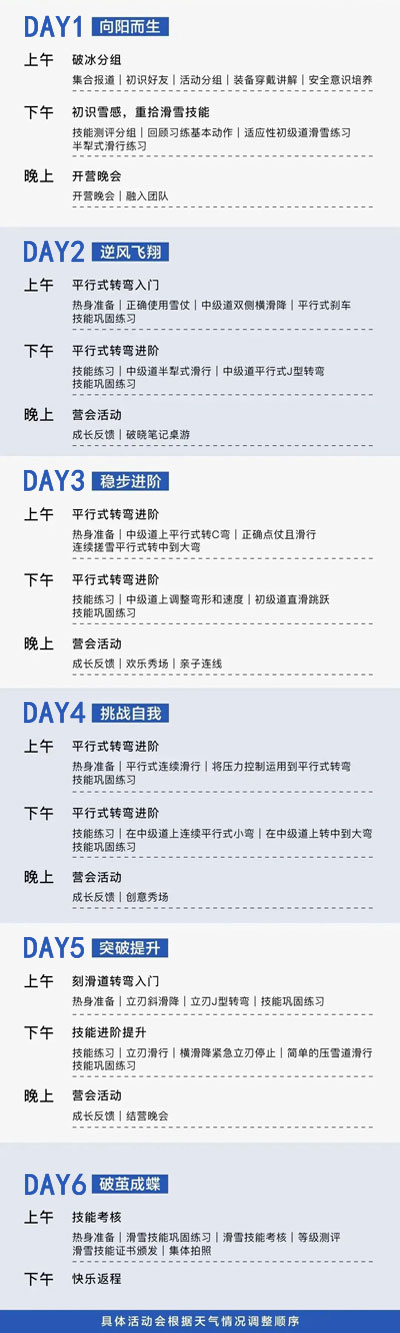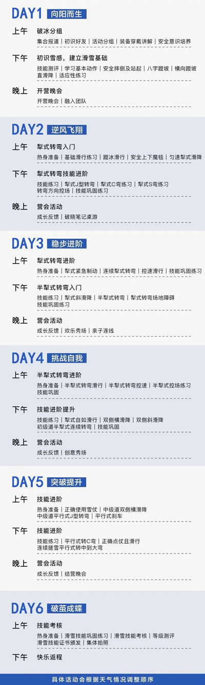 7、活动费用:营会期间所有滑雪外活动、营长及生活导师费用、材料费用及器材使用费用等;