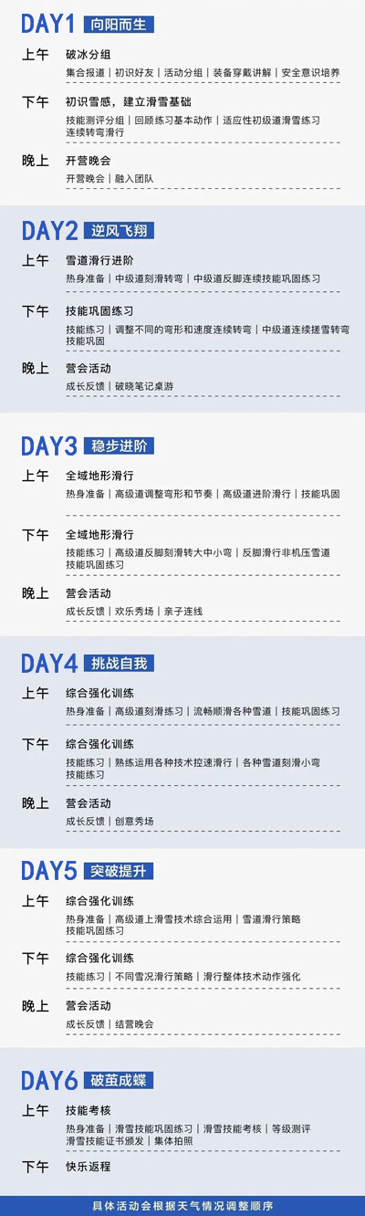 滑雪冬令营课程从孩子的兴趣爱好出发,分设双板和单板两种滑雪课程。由专业团队遵循UYoung儿童滑雪教学体系,细分等级,设计出适宜的课程安排。