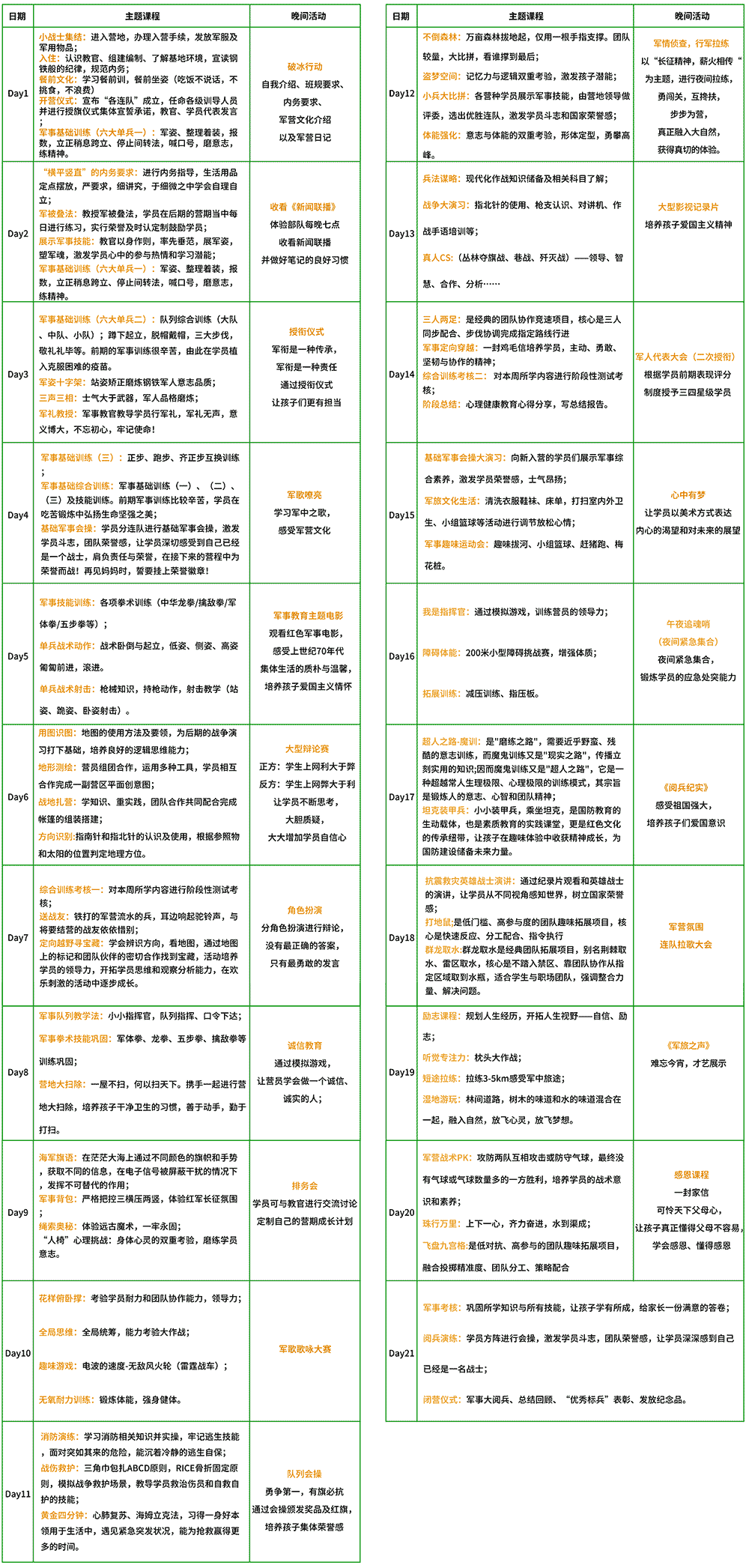 21天好习惯塑造军事夏令营课程安排