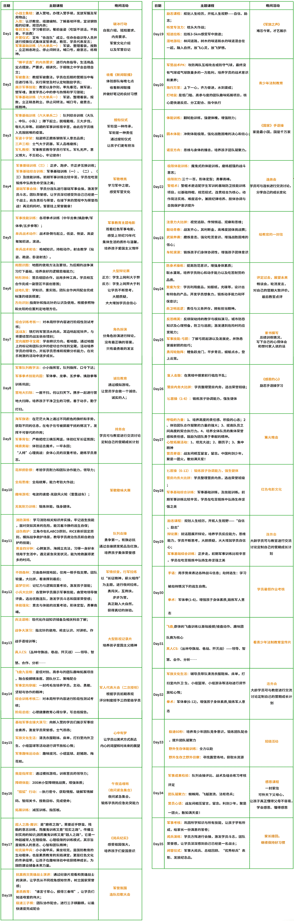 注: 1、具体课程执行情况根据天气情况和和班级营员体质情况等外在因素进行相应调整。 2、内务和行为规范始终以军校模式进行高标准严要求,纳入日常作训生活和每一个课程。 3、每日进行作业自主书写(携带作业及相关课外书籍)。