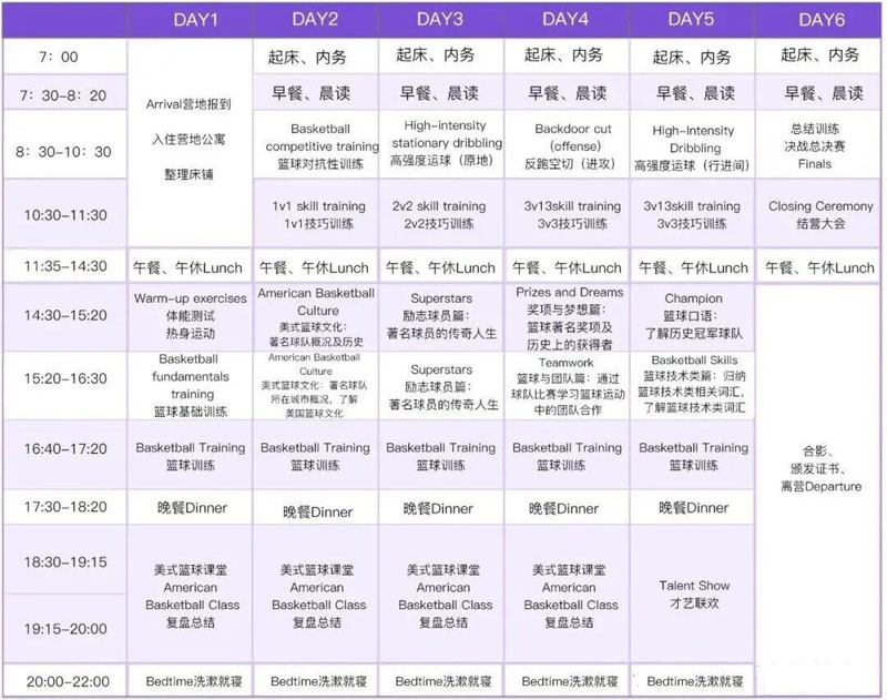 白天篮球激战,夜晚环游美职联Part 02<<<<<<<1英语诗歌晨读帮助孩子养成早起晨读英语的好习惯!在英语主教练Peter老师的带领下,迎着朝阳,大声朗读英文励志诗歌,开启元气满满的一天! 2篮球技能特训基础技能夯实:国际导师们从最基础的篮球技能教起。 运球训练:孩子们学习高低运球、变向运球等技巧,通过一系列趣味练习,如运球接力赛,让孩子们在竞争中提升熟练度。 传球训练:着重强调传球的力度、方向与准确性,双人对传、三角传球等练习,让孩子们逐渐掌握传球精髓。 投篮训练:从姿势纠正入手,通过定点投篮、移动投篮等方式,帮助孩子们找到适合自己的投篮节奏。 战术与团队协作:篮球战术与团队协作训练也是必备环节,教练会根据孩子们的年龄与水平,讲解并演练各种战术,如快攻战术、联防战术等。在团队对抗练习中,孩子们学会如何与队友沟通配合,找到自己在团队中的位置,领悟团队篮球的魅力。 3美式篮球文化探秘美式篮球历史与文化:夜幕降临,孩子们走进教室,开启美式篮球文化之旅。国际导师以生动的故事、精彩的视频,为孩子们讲述美式篮球的起源与发展,从早期的艰难创业到如今的全球篮球盛宴,让孩子们深入了解这项运动背后的历史底蕴。 球星传奇与励志故事:每一个篮球巨星都有一段传奇经历。课堂上,孩子们将认识迈克尔•乔丹、科比•布莱恩特、勒布朗•詹姆斯等巨星,了解他们如何从平凡走向卓越,学习他们坚韧不拔、追求梦想的精神。 球队风采与特色:30 支球队各具特色。导师带领孩子们逐一认识每支球队,从球队的队名由来、队徽设计,到球队的经典比赛与辉煌战绩,让孩子们对每支球队都有深入的了解。 篮球英语专项学习:导师教授孩子们专业的篮球术语,如 “slam dunk(扣篮)”“block shot(盖帽)”“three - point line(三分线)” 等,通过词汇游戏、情景对话等方式,让孩子们轻松掌握并能熟练运用。