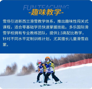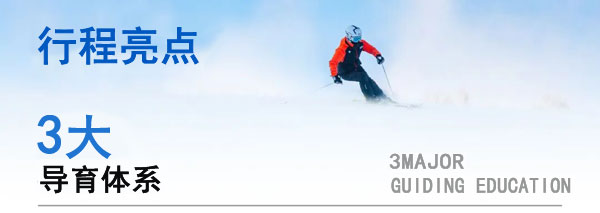 • 高级进阶|风格探索,突破自我 适合高效:定制适合的教学方案课程体系参考大众滑雪等级和新西兰滑雪教学双体系优势,推出趣味性闯式课程,形成3阶9级滑雪基础教学体系及专项进阶体系,为营员定制适合的教学方案, 更专业,更有针对性!