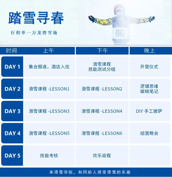 除此以外,雪场健全的医疗保险体系以及经验丰富的雪地巡逻员,让您在享受滑雪带来的快乐的同时,忘却后顾之忧。 24小时“保姆级”全方位陪伴【踏雪寻春】每位导师拥有丰富与营员相处的经验,多次带队冬夏令营。