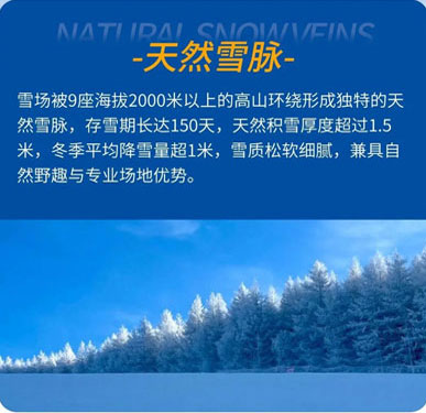 ● 自然环境优良:天然积雪厚度超过1.5M,存雪时长达150天,难得一见的天然雪脉,雪质优良