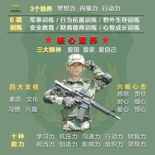 孩子能学到什么?征服者军事特训营成长体系 征服者军事夏令营由昆明广播电视台和“征服者”共同打造,跟踪报道,保障家长和孩子的权益