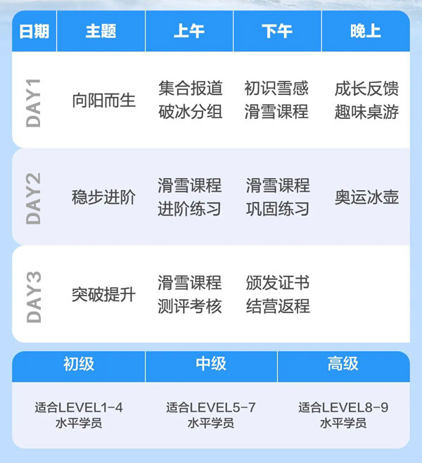 CURRICULUM SYSTEM课程体系UYoung青少年滑雪学院,结合全球各大滑雪体系,以「北京大众滑雪锻炼等级标准」为总纲,打磨出了更适合中国青少年体制的1-9级进阶式教学体系,高效培养滑雪技能,专业学习考核。 学院设置了双板和单板两种滑雪课程,孩子们可以按照自身需求灵活选择。 SKI CHAMPION CAMP三天两晚元旦营 SKI CHAMPION CAMP酷炫夜滑嗨翻天夜滑体验:微风吹佛的傍晚,色彩斑斓的灯光,前面是臂膀坚实的教练,身后是棋逢对手的伙伴。 多年后孩子们依然会记得,儿时的某个冬夜,曾穿过呼啸山顶,享受肆意欢笑的勇敢童年。SKI CHAMPION CAMP缤纷营地活动美好的冬日雪国,有缤纷营会相伴!每天除了滑雪,孩子们最快乐的moment,就是吃完晚饭,和新结识的小伙伴一起手拉手参加晚课活动。 大秀诗歌朗诵、琴棋歌艺、还有酷炫的街舞rap...一起脑洞大开环保秀,简直不要太开心。