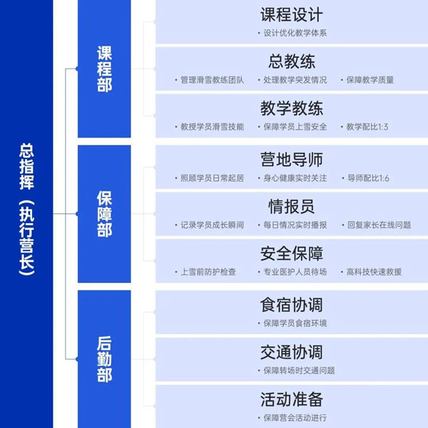 HIGHLIGHTS OF THE CAMP营会亮点01 每次雪季的到来对我们来说都是新的挑战,场地、教学、管理、执行、服务、保障,每处细节都经历过团队的无数次迭代。 滑雪冬令营为少年提供了适合孩子提升技能和锻炼独立自主的单飞营,让孩子在营期中不仅能收获技能,更能结交志同道合的小伙伴。★ 少年单飞针对有一定独立生活能力的孩子,想要独立参加滑雪营的学习和结交新的伙伴。 单飞营能够锻炼孩子的独立性和自我管理能力,提供更多与同龄人交流和互动的机会,增进友谊,同时获得滑雪技能的提升。 冬令营训练场地——八达岭滑雪场坐落于北京延庆区,景色秀美。距市区仅50分钟车程,让孩子在身边轻松学滑雪,在京内就能驰骋雪道,享受冰雪乐趣,快乐成长。在这里,孩子们既能享受滑雪的快乐,又能提升技能,收获自信与成就感。全方位营地管理体系阶梯式滑雪教学体系 营会活动由一整个团队共同构建完成,前期设计、整体执行、后勤保障,分设了专门执行团队,保障每个环节的落地。 ① 执行营长:营会中的大家长