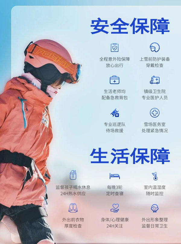SECURITY GUARANTEE安全保障03营会从安全保障、生活保障、教学保障三个方面定制了严格的执行规范。做好学员保障是最基础的要求。雪场内配备专业的医生待岗,营地周边有镇级卫生院。