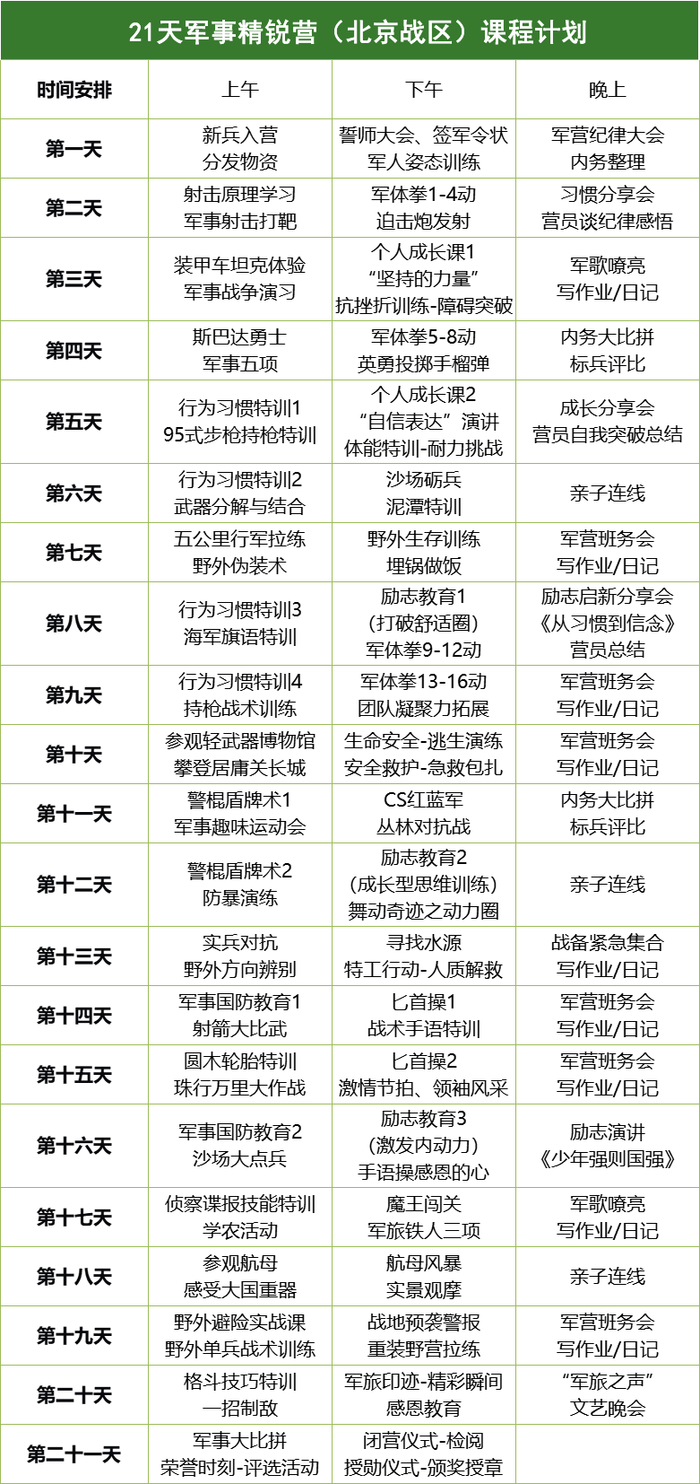 21天军事精锐夏令营课程安排