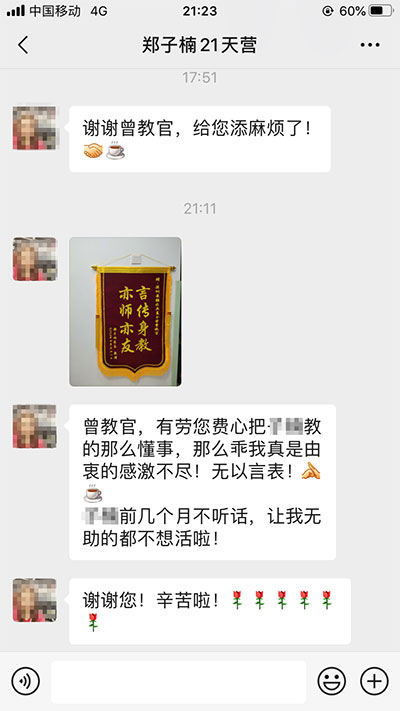 不放弃,坚持到底。才是特训目的,考验学员坚持自己,遇到困难不轻易逃避,迎刃而上的坚定信念■第六天一感恩教育【审视反省弹性成长】