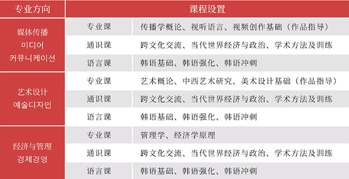 涵盖传媒、艺术、经管三大专业类别,开设专业多,生源规模大,教学师资以本校经验丰富教师为主,帮助学员夯实韩语、专业课程基础,助力学员赢在海外留学起跑线上。