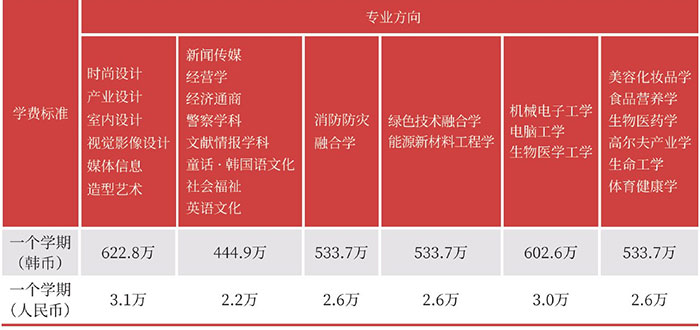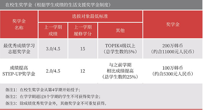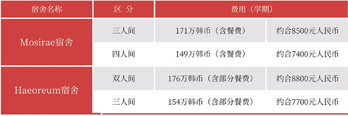 2、上述金额是包含'外国人留学生生活馆居住支援‘奖学金’(80万韩币)'的金额,并且此奖学金只适用于学生进入韩国之后居住学校宿舍的第一年,而之后的第二年开始不适用此奖学金;