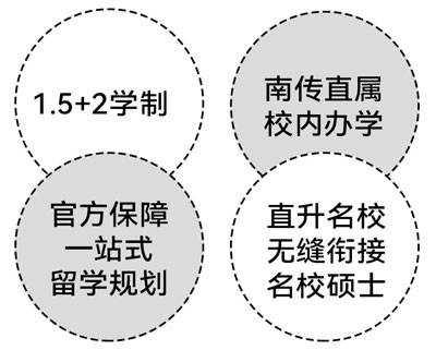 作为南京传媒学院直属的归口负责国际教育的教学单位,南传国际学院联合多所海外顶尖传媒艺术名校,开展国际本科项目,面向全国招收有意向出国留学就读本科的学生,学生全日制在南传学院完成我校与海外院校联合设立的1.5年学制的出国留学预备课程;完成预备课程后,凭课程结业证书及留学外语成绩,将升入与我校建立校际合作关系的海外大学续读本科后续课程,获得海外大学本科文凭。