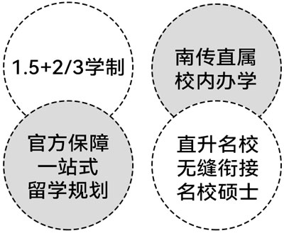 作为南京传媒学院直属的归口负责国际教育的教学单位,南传国际学院联合多所海外顶尖传媒艺术名校,开展国际本科项目,面向全国招收有意向出国留学就读本科的学生,学生全日制在南传学院完成我校与海外院校联合设立的1.5年学制的出国留学预备课程;完成预备课程后,凭课程结业证书及留学外语成绩,将升入与我校建立校际合作关系的海外大学续读本科后续课程,获得海外大学本科文凭。