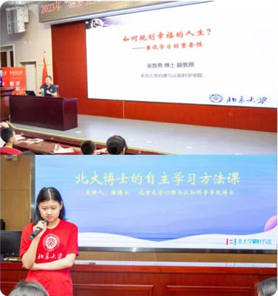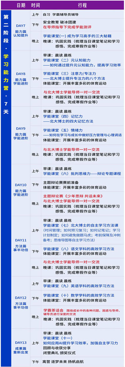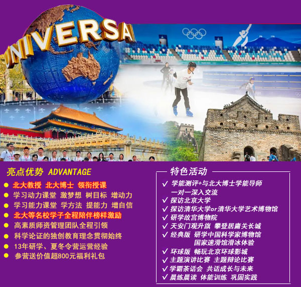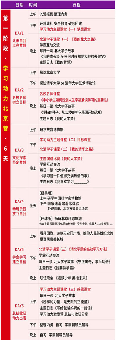 05内容丰富 深度体验 | 由北大教授、北大博士领衔授课,4堂学习动力课堂(梦想、幸福、目标、感恩)+11堂学能提升课堂(记忆力、专注力、思维力、学科高效学习方法......)+3堂北清学霸课堂+北大博士学能导师进行一对一深入交流+探访北京大学+探访清华大学or清华大学艺术博物馆+经典版(研学中国科学家博物馆+国家速滑馆滑冰体验)or环球版(畅玩北京环球影城)+研学北京故宫博物院+攀登居庸关长城+主题演讲赛+主题辩论赛及辩论专业指导+学霸茶话会+团队建设+联谊晚会+每日一读学霸故事+主题日志+晨读晨练+体能训练等丰富多彩的课程和活动,让孩子们玩中学、学中玩,享受学习的快乐、享受游玩的快乐、享受成长的快乐。