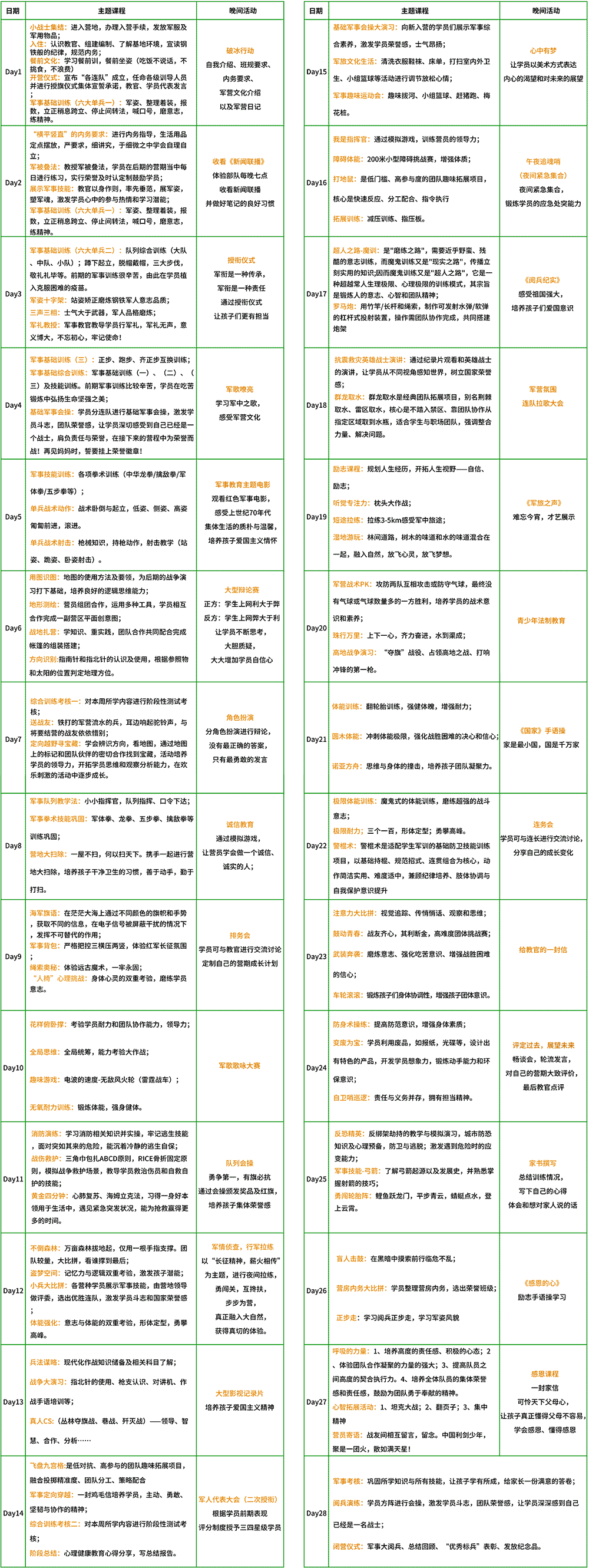 注: 1、具体课程执行情况会根据天气情况和班级营员体质情况等外在因素进行相应调整。 2、内务和行为规范始终以军校模式进行高标准严要求,纳入日常作训生活和每一个课程。